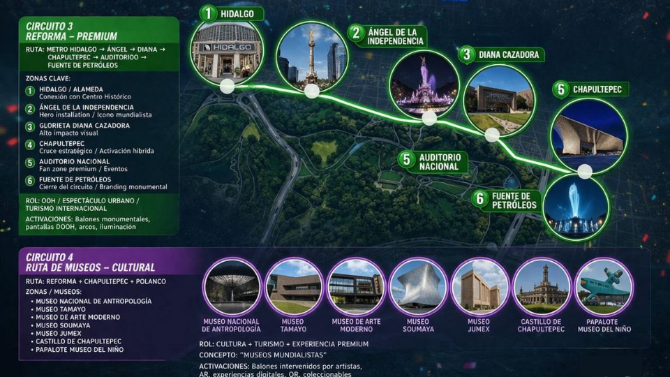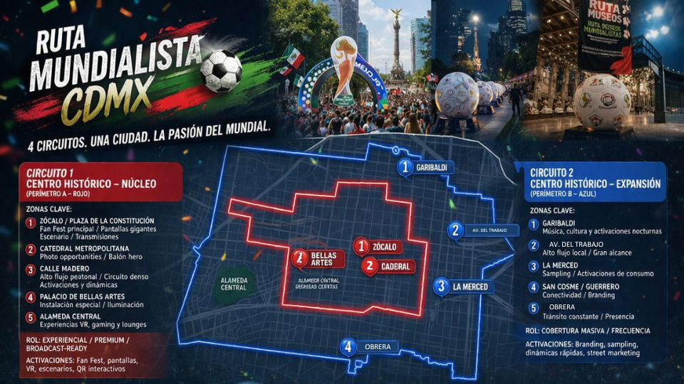 El corazón de la experiencia. Desde el Zócalo hasta la Alameda Central, este circuito ofrece activaciones de alto impacto como fan fests, pantallas gigantes, experiencias VR y espacios interactivos.